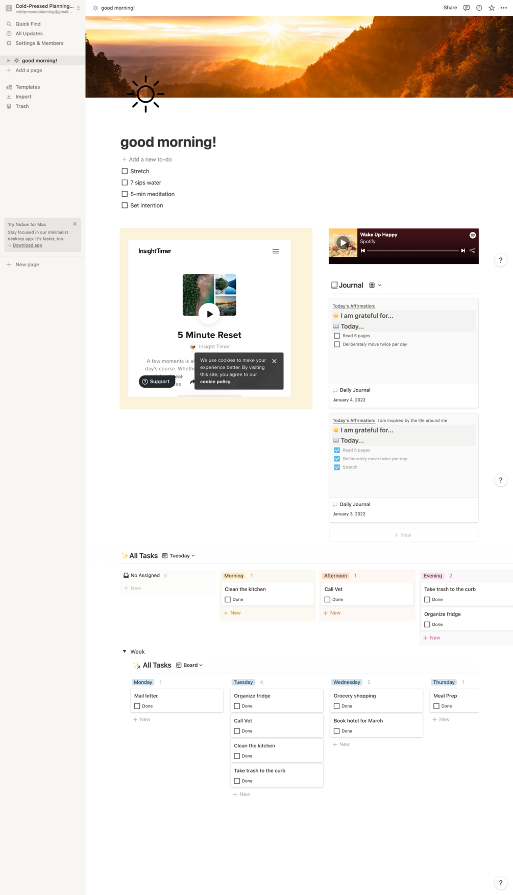 First thing in the morning, I click the "+ Add a new to-do" button to populate the very simple tasks I do each day. Starting with little tasks helps me ease into the day before moving onto my bigger tasks. Drag the completed to-dos into a new journal page, and use the embedded Insight Timer page to start a guided meditation (embed only works on phone version, and you will need the free app). Use the Morning Afternoon and Night sections to loosely plan your day, and expand the "Week" button to see your tasks for the rest of the week.